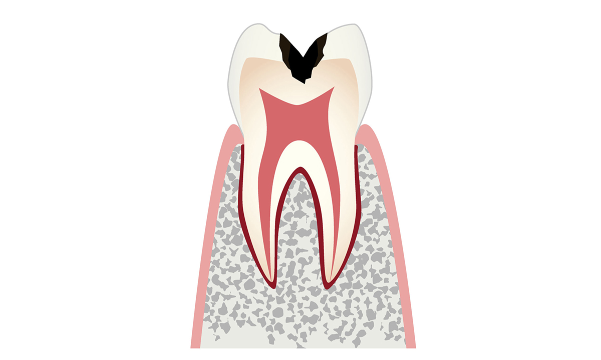 歯を守っているエナメル質という層に穴があいています。歯の表面が黒く見えて、舌で触るとザラつきがありますが、自覚症状はあまりありません。虫歯にかかっている箇所を削り、白い詰め物をして修復します。この段階であれば、麻酔を使わずに治療できます。